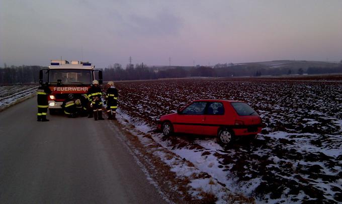 Daher wurde um 16:20 Uhr die FF Markersdorf-Markt von der Bezirksalarmzentrale zu einer Fahrzeugbergung alarmiert. Bereits wenige Minuten nach der Alarmierung konnte das LFB mit 8 Mann zum Einsatz ausrücken. Vor Ort wurde das verunfallte Fahrzeug aus der Furche zurück geschoben und anschließend mittels Kette und zweier provisorischen Auffahrtsrampen aus dem Feld gezogen. Den Abtransport des Fahrzeugs wurde von Lenker selber durchgeführt. So konnte die FF Markersdorf-Markt nach rund 30 Minuten wieder einrücken.