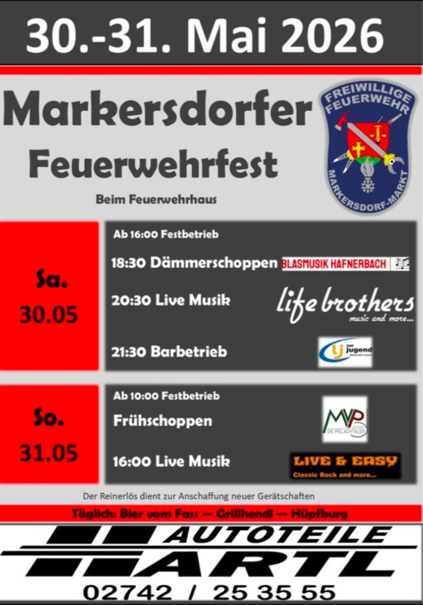 Bald ist es wieder so weit! Daher möchten wir Sie auf diesem Weg zu unserem Feuerwehrfest, welches am 30 und 31.Mai 2026 stattfinden wird, einladen.Das ProgrammSamstag:Ab 16 Uhr, FestbetriebAb 18:30 Dämmerschoppen (Blasmusik Hafnerbach) Ab 20:30 Uhr unterhalten Sie die "Life Brothers" Ab 21:30 Uhr Barbetrieb mit der Landjugend Markersdorf-HaindorfSonntag:Ab 10:00 Uhr FestbetriebFrühschoppen mit dem Musikverein "die Pielachtaler"Ab 16:00 Uhr Live Musik (Live&Easy) Wir freuen uns schon jetzt, Sie als Gast bei unserem Fest begrüßen zu dürfen. Für Speisen und Getränke ist bestens gesorgt!