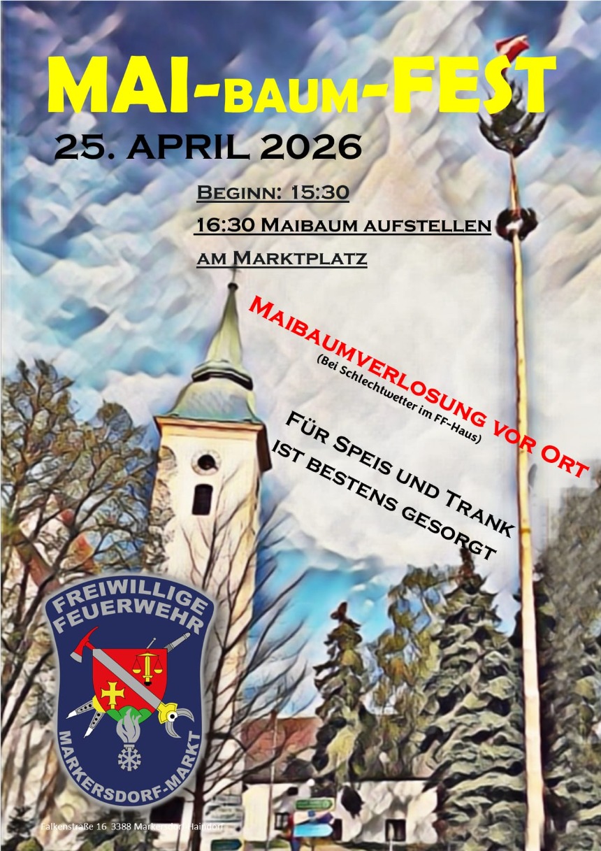 Auch heuer findet traditionell wieder das Maibaum aufstellen am Marktplatz statt.Am 25.April 2026Beginn: 15:30Maibaumaufstellen:16:30Lose für die Tombola sind ausschließlich nur am Fest erhältlich.Lospreis: 5€