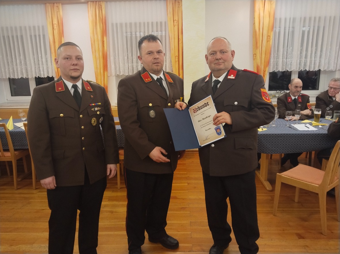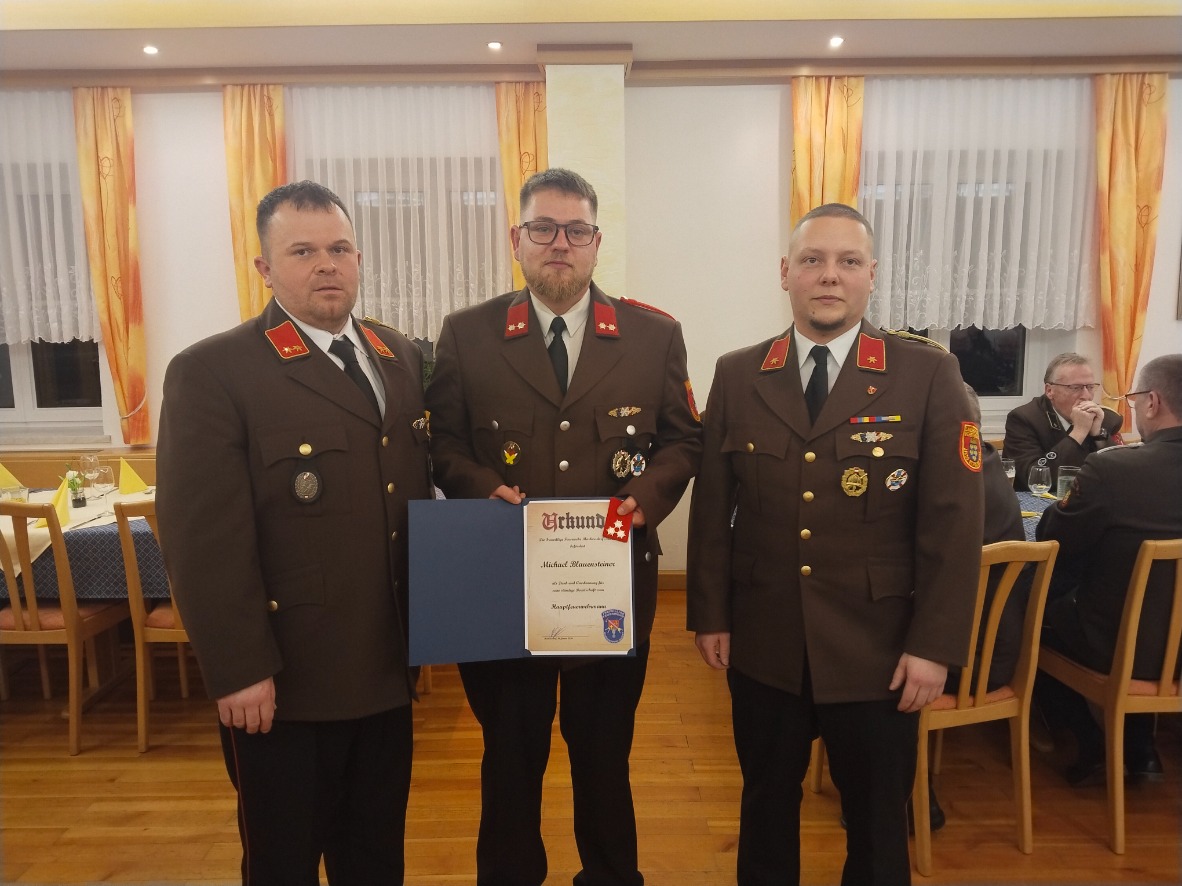 Am 16.Jänner fand im GH Zauner unsere 136. Jahreshauptversammmlung statt. Nachdem die Beschlussfähigkeit festgestellt wurde, begann unser Kommandant OBI Manuel Steinwendtner mit der Begrüßung der Ehrengäste, Mitglieder der Reserve, aktive Kameraden und unterstützende Mitglieder. Anschließend an die Begrüßungen folgte ein Totengedenken an die verstorbenen Kameraden. Heuer standen auch wieder die Wahlen an, die alle 5 Jahre durchgeführt werden. OBI Manuel Steinwendtner und BI Daniel Heimberger wurden für die nächsten 5 Jahre erneut gewählt. Unser Verwalter V Thomas Dür legte sein Amt zurück und unser Kommando ernannte ihn als Eherenverwalter für seine Tätigkeiten. Sein Amt wird jetzt Alois Heimberger weiterführen. Danach folgten die Berichte des Verwalters und der Kassenprüfer. Anschließend hörten wir die Tätigkeitsberichte der Sachbearbeiter, sowie von unserem Kommando OBI Manuel Steinwendtner und BI Daniel Heimberger. Als nächstes standen die Beförderungen am Programm wo Elias Grünbichler zum Löschmeister und Michael Blauensteiner zum Hauptfeuerwehrmann befördert wurden. Weiteres hörten wir die Ansprache von Bürgermeister Friedrich Ofenauer, Unterabschnitts Kommandant Walter Diesmayr und Ortstellenleiter vom Roten Kreuz Prinzersdorf Martin Stieger.